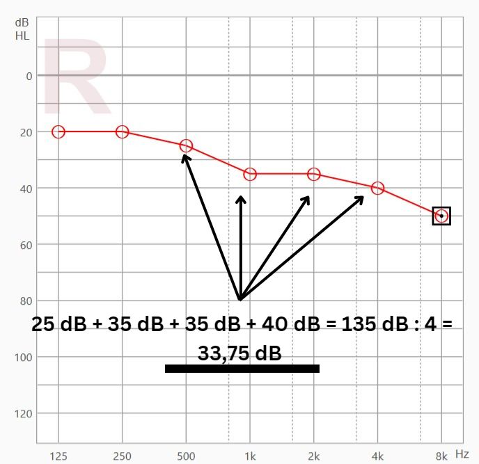 Für die Berechnung der Dezibel wird aus einem Audiogramm der Mittelwert aus den Messergebnissen bei den Tonlagen 500 Hz, 1000 Hz, 2000 Hz und 4000 Hz gebildet.