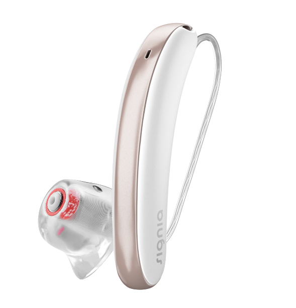 Das wiederaufladbare Hörgerät sitzt hinter dem Ohr, während der Klang über einen externen Lautsprecher übertragen wird, der im Gehörgang platziert ist.