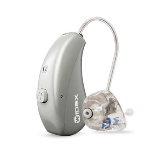 Diese Akku Hörgeräte von Widex sind wirklich kleine Exemplare mit externem Lautsprecher, die hinter dem Ohr getragen wird. Hier abgebildet mit einer Maßotoplastik.