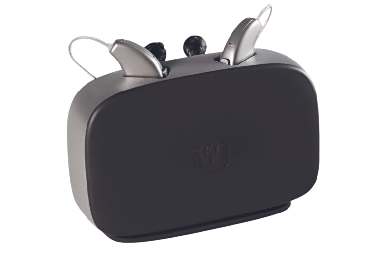 Das Bild zeigt als Beispiel die Charging+ Station von AudioService. Diese trocknet und reinigt die Hörgeräte während dem Ladeprozess. Aber Vorsicht: Reinigung bezieht sich hier auf eine UV-Bestrahlung, die zwar Bakterien und Viren unschädlich macht, jedoch keine Verschmutzung an sich entfernt.