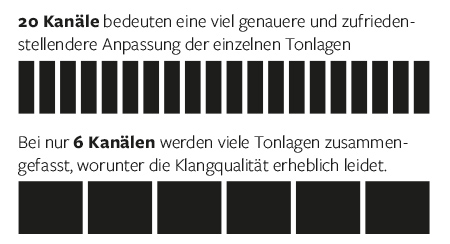 Aktuelle Hörgeräte teilen den Bereich zwischen hohen und tiefen Tönen in Scheiben auf. Hier ist von Kanälen die Rede. Jeder Kanal verfügt über einen bestimmten Klangbereich. Der Kanal schließt sich daran mit den entsprechend tieferen oder höheren Tönen an. Ein Hörgerät hat die Möglichkeit, in jedem Kanal die Verstärkung unabhängig von dem daneben liegenden einzuregeln.